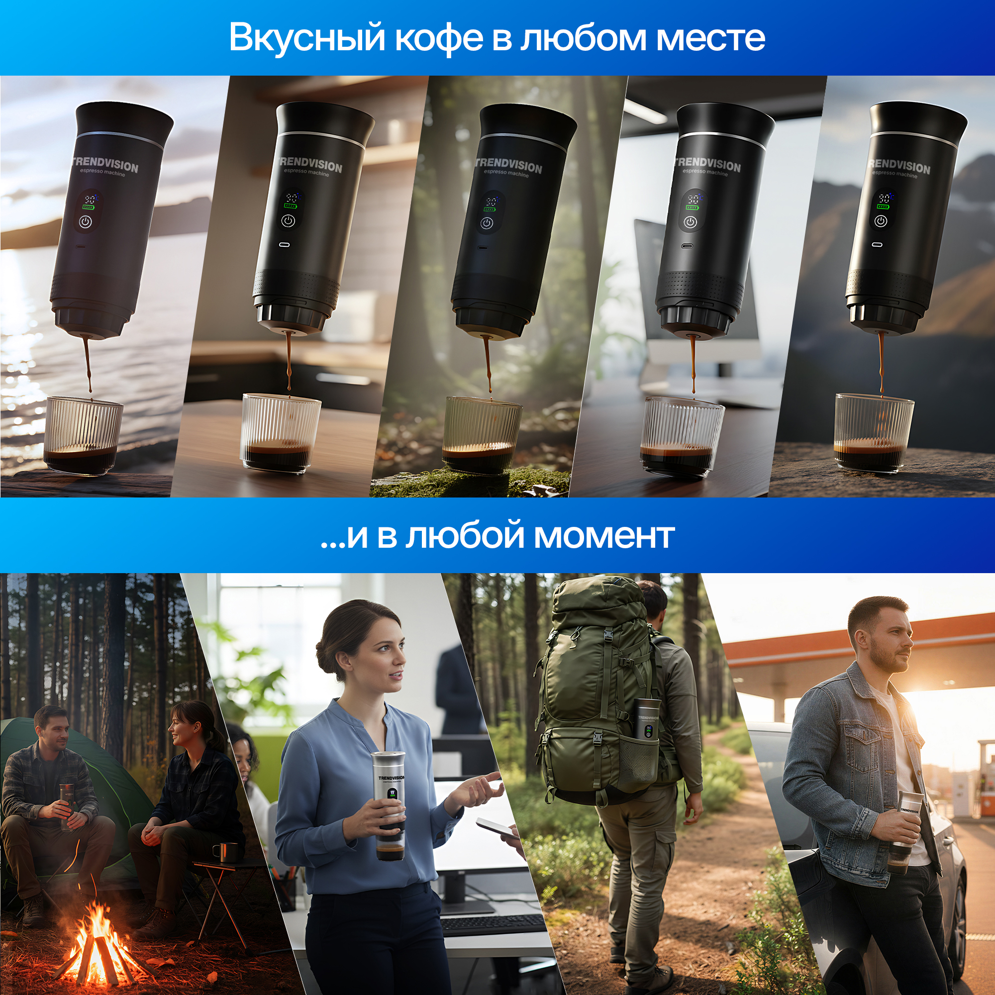 TrendVision Travel Coffee Maker создана для использования в самых разных сценариях повседневной жизни. Кофемашина одинаково удобна в поездках на автомобиле, во время пеших прогулок и походов, на отдыхе на природе, в офисе или в рабочей обстановке вне дома. Компактные размеры и автономная работа позволяют брать её с собой без ограничений и готовить кофе именно тогда, когда это нужно.