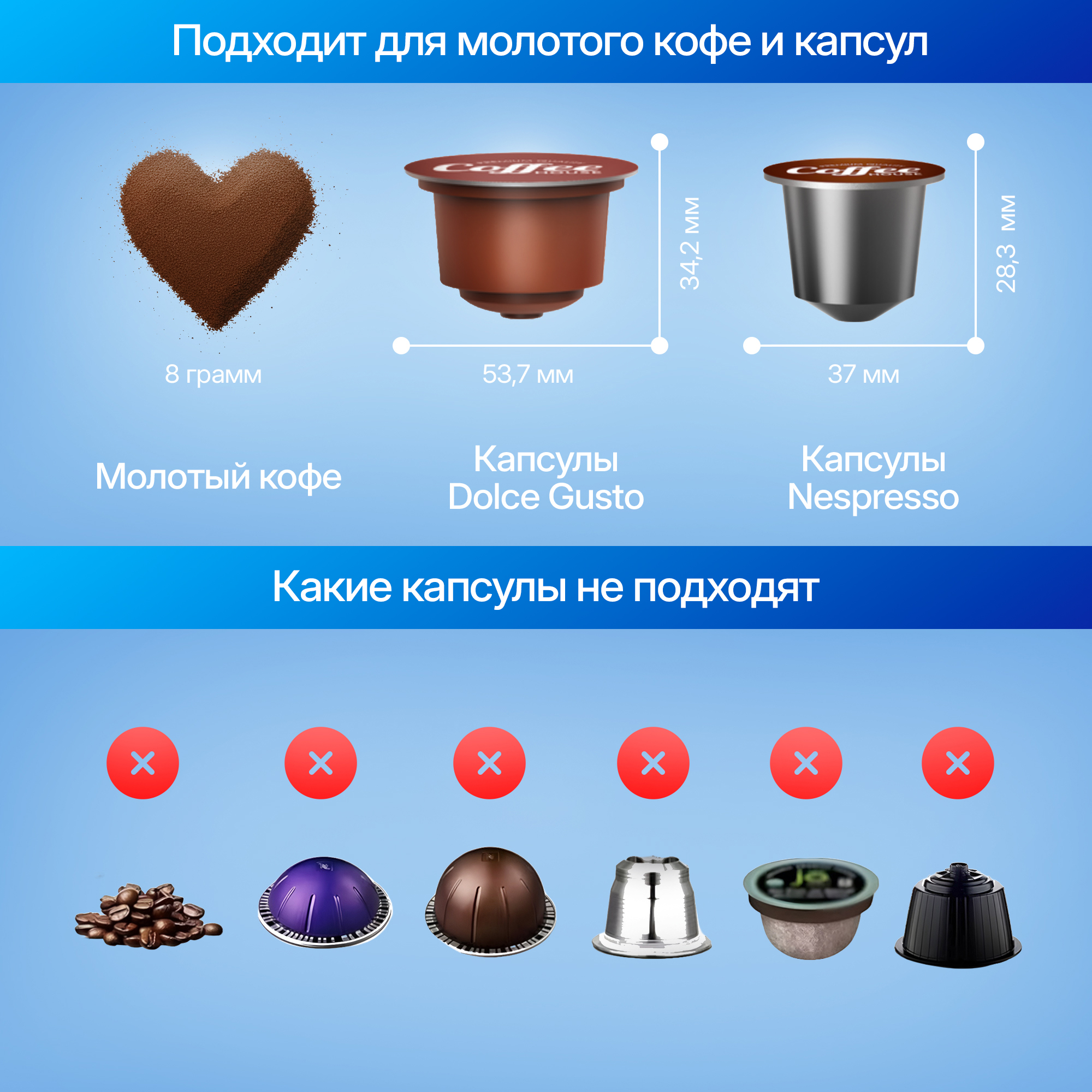 металлические и многоразовые капсулы, не соответствующие формату Nespresso или Dolce Gusto