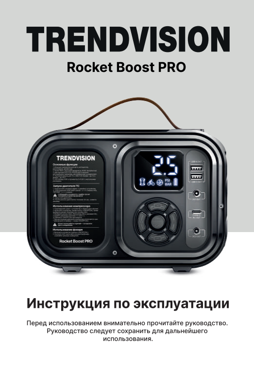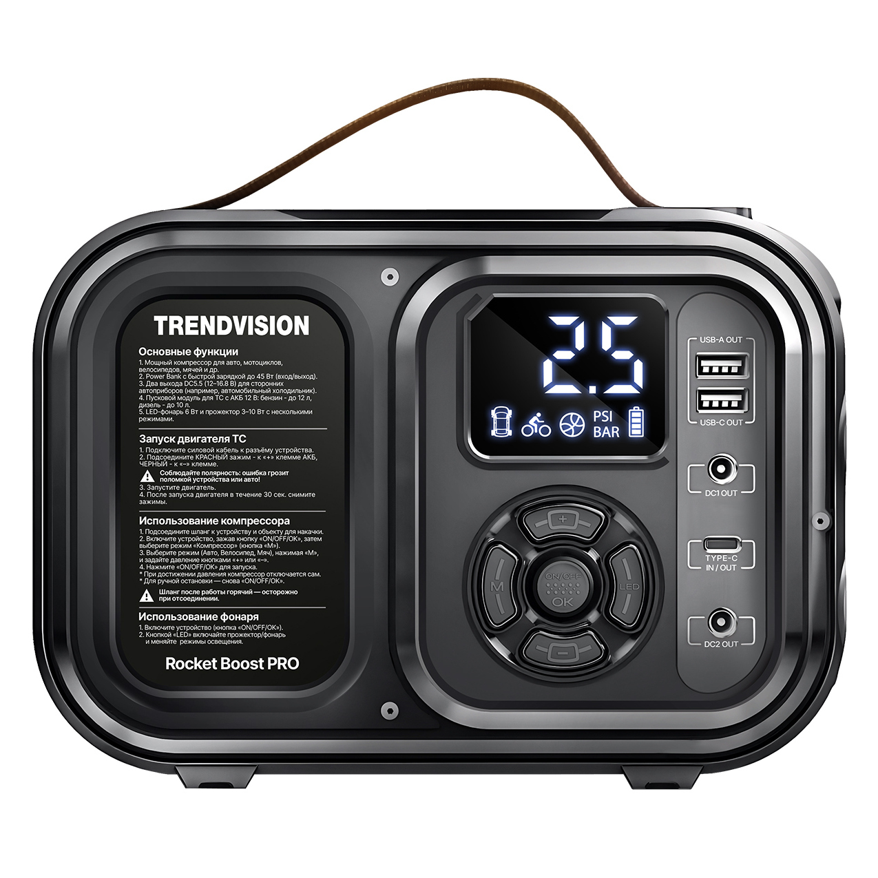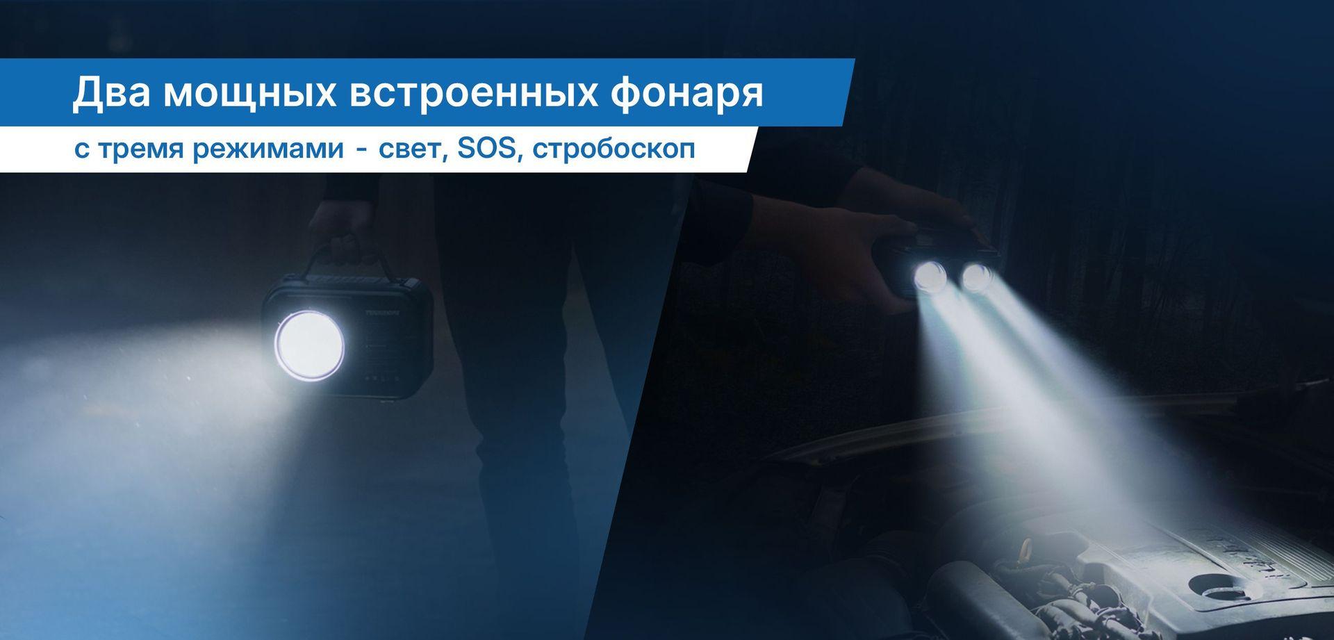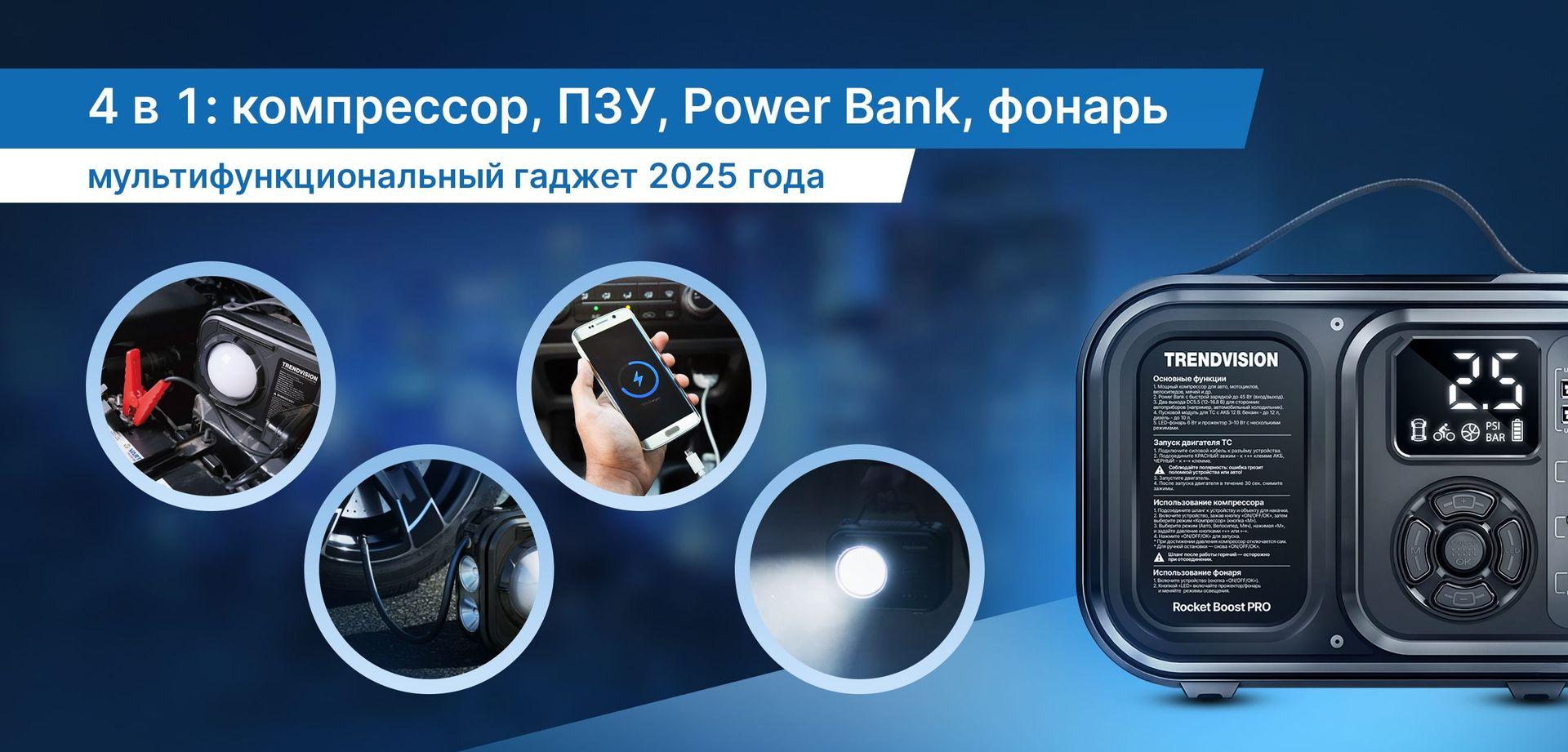 Одно устройство совмещает сразу четыре ключевые функции: беспроводной компрессор, мощное пуско-зарядное устройство, внешний аккумулятор (powerbank) и яркий прожектор с фонарём, обеспечивающий широкое и дальнее освещение.