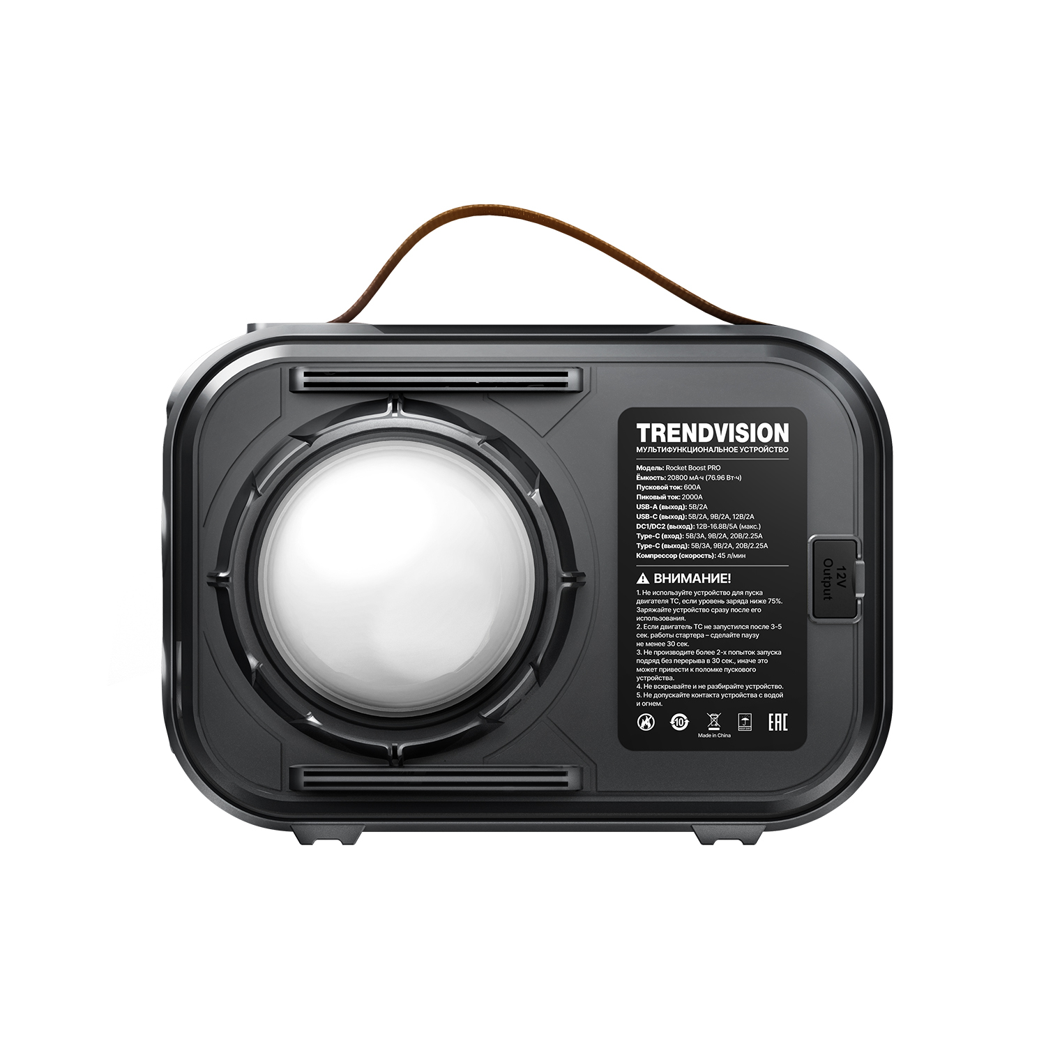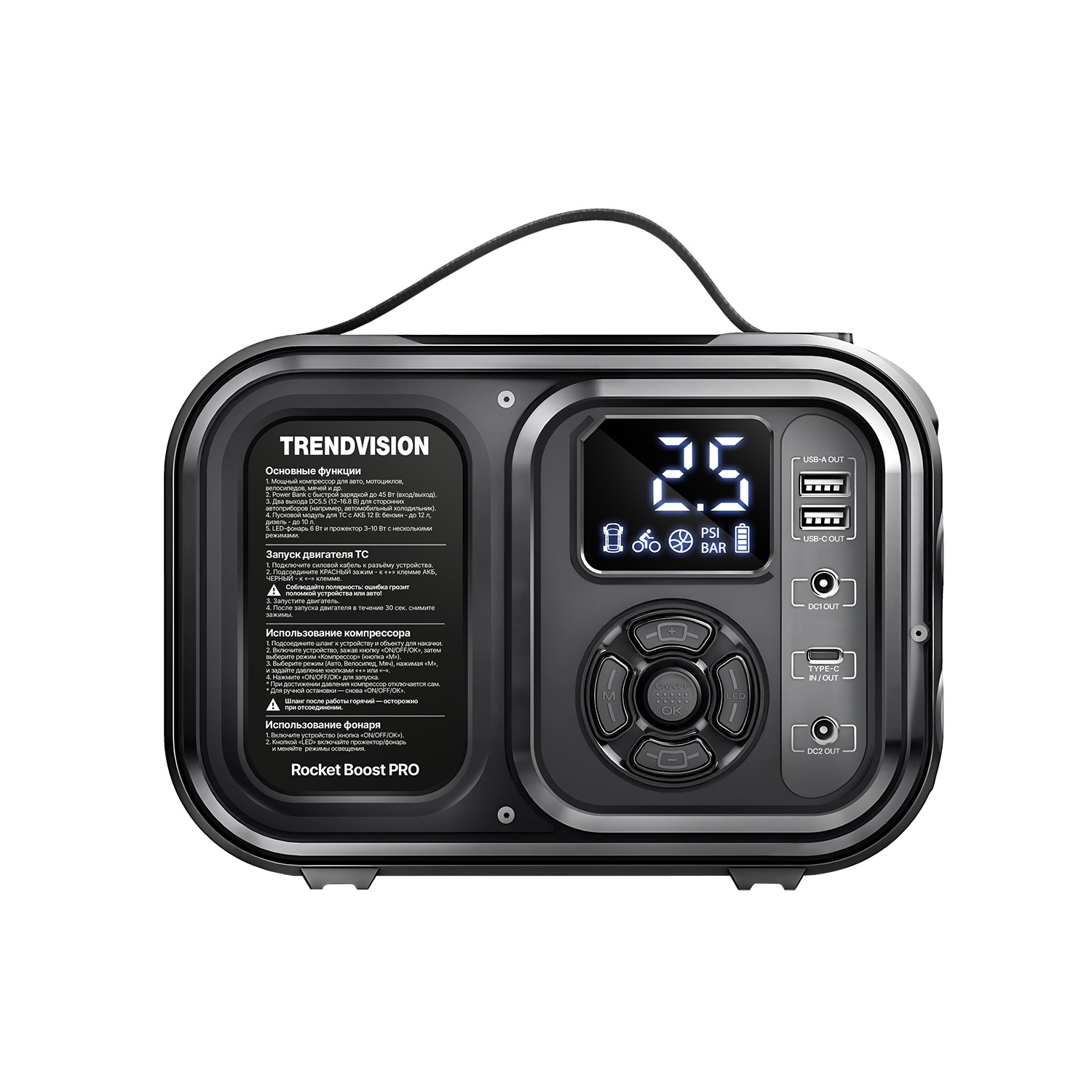 TrendVision Rocket Boost PRO — это универсальное устройство «четыре в одном», сочетающее в себе пуско-зарядное устройство, беспроводной компрессор, powerbank и фонарик. Оснащённый ёмким аккумулятором на 20 800 мАч, он способен запускать двигатель любого транспортного средства при полностью разряженной батарее или в условиях сложного зимнего пуска. Помимо этого, прибор позволяет быстро и без лишних усилий подкачать колёса автомобиля благодаря встроенному компрессору, а также зарядить смартфоны, планшеты и другую электронику, используя функцию внешнего аккумулятора. Дополнительным преимуществом является встроенный фонарик, который выручит в дороге в тёмное время суток.