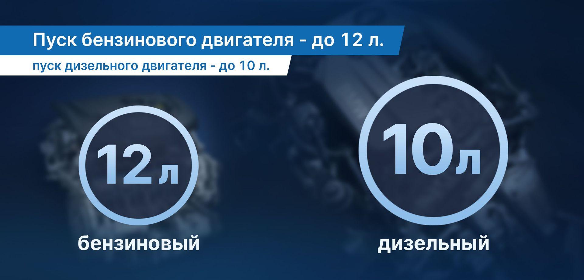 Устройство рассчитано на уверенный запуск бензиновых двигателей до 12 литров и дизельных до 10 литров, что делает его совместимым с большинством легковых авто, внедорожников, грузовиков и коммерческим транспортом.