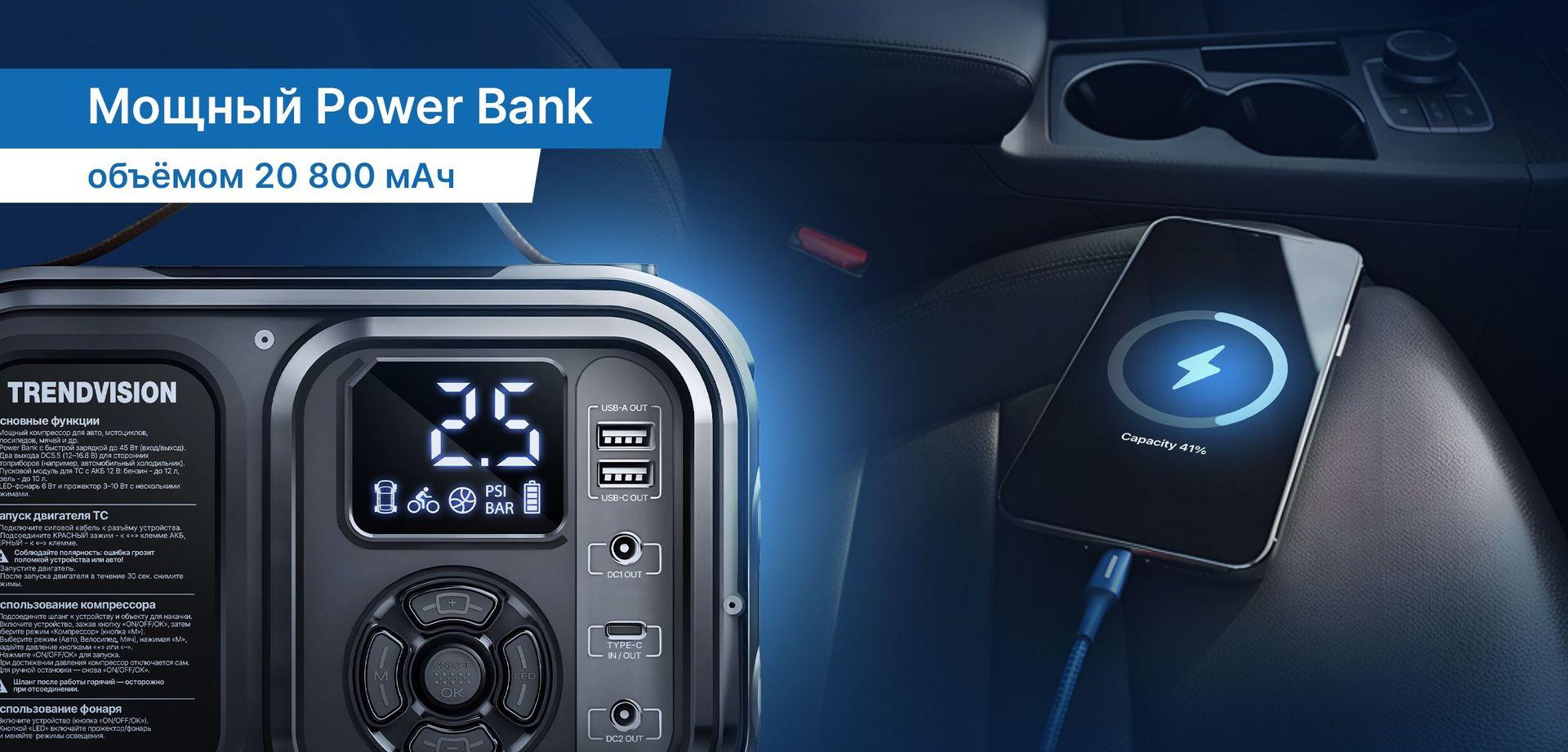 Ёмкий встроенный аккумулятор обеспечивает достаточно энергии для многократной зарядки смартфонов, планшетов и других устройств. Это позволяет оставаться на связи, использовать навигацию и поддерживать работу гаджетов даже во время длительных поездок.