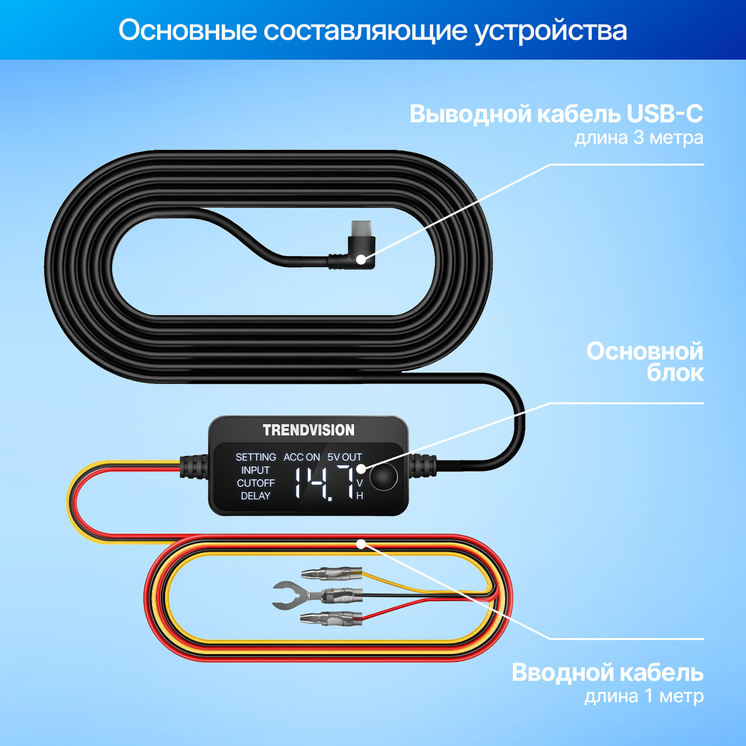 Устройство состоит из основного блока с дисплеем, выводного кабеля USB Type-C для подключения видеорегистратора длиной 3 метра и вводного кабеля длиной 1 метр для подключения к бортовой сети автомобиля.