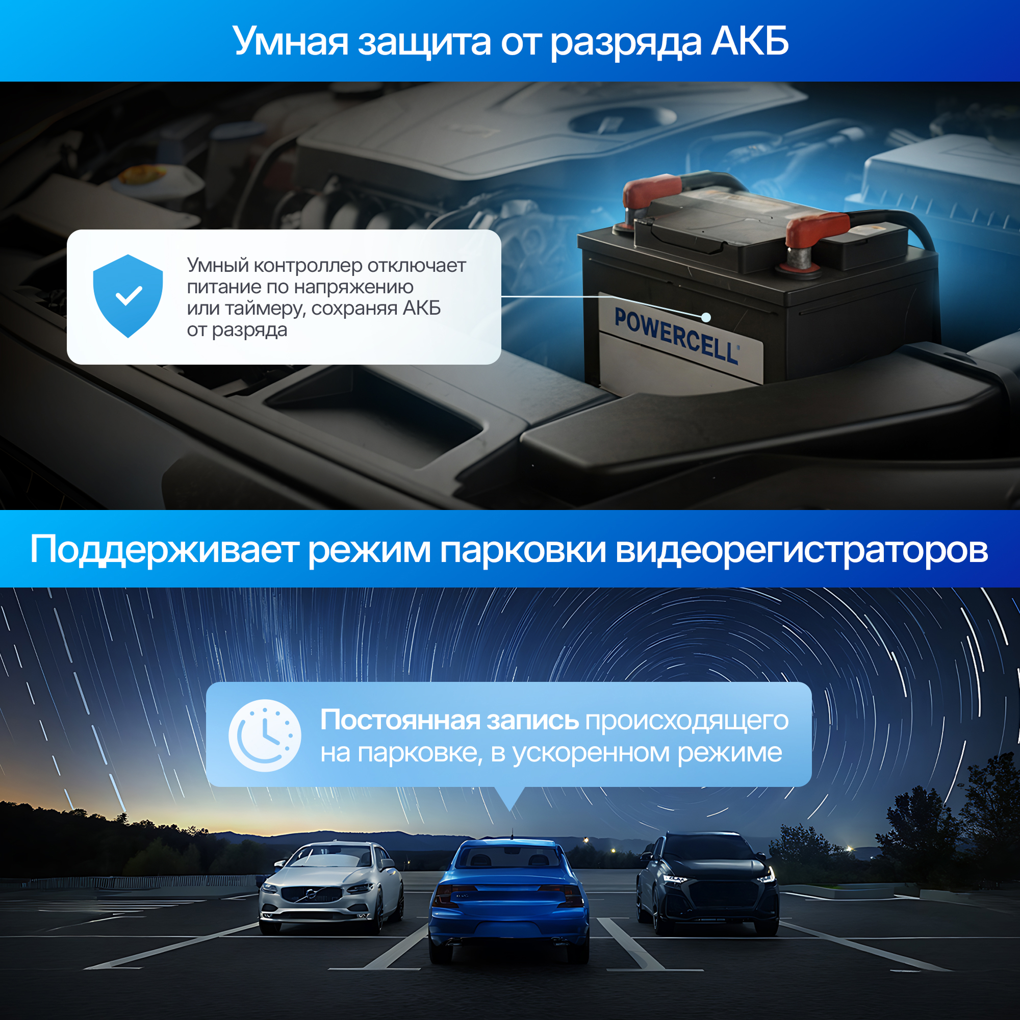 В Pro-версии реализован встроенный цифровой вольтметр и функция отложенного отключения питания, благодаря чему можно точно задать условия работы парковочного режима и защитить аккумулятор от переразряда. При этом интеллектуальная защита АКБ присутствует в обеих версиях и автоматически отключает питание при критическом снижении напряжения.