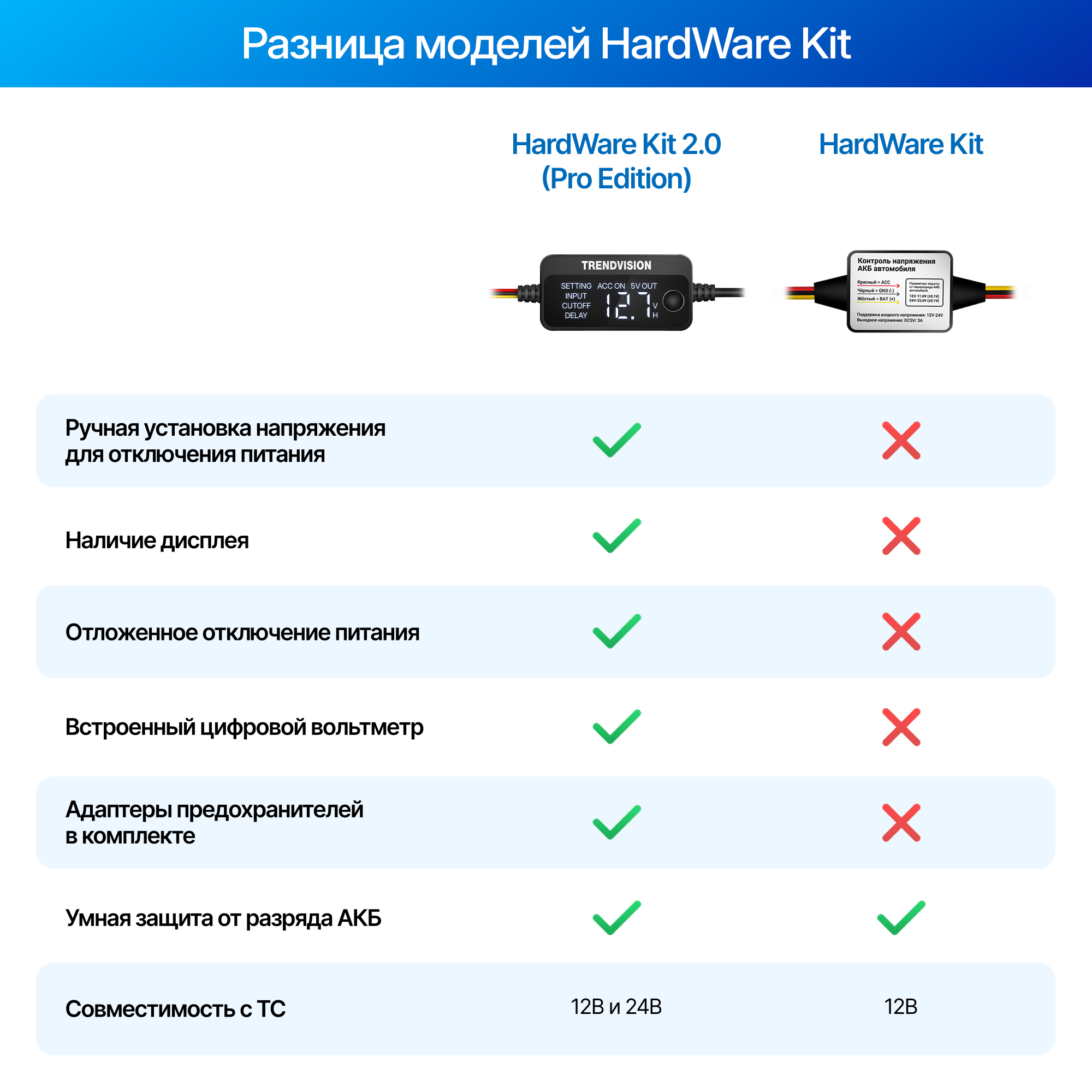 Обычный HardWare Kit выполняет базовую задачу — обеспечивает постоянное питание и защиту аккумулятора, но не имеет дисплея, расширенных настроек и адаптеров в комплекте. HardWare Kit 2.0 (Pro Edition) ориентирован на тех, кому важен максимальный контроль, универсальность и удобство при установке и эксплуатации.