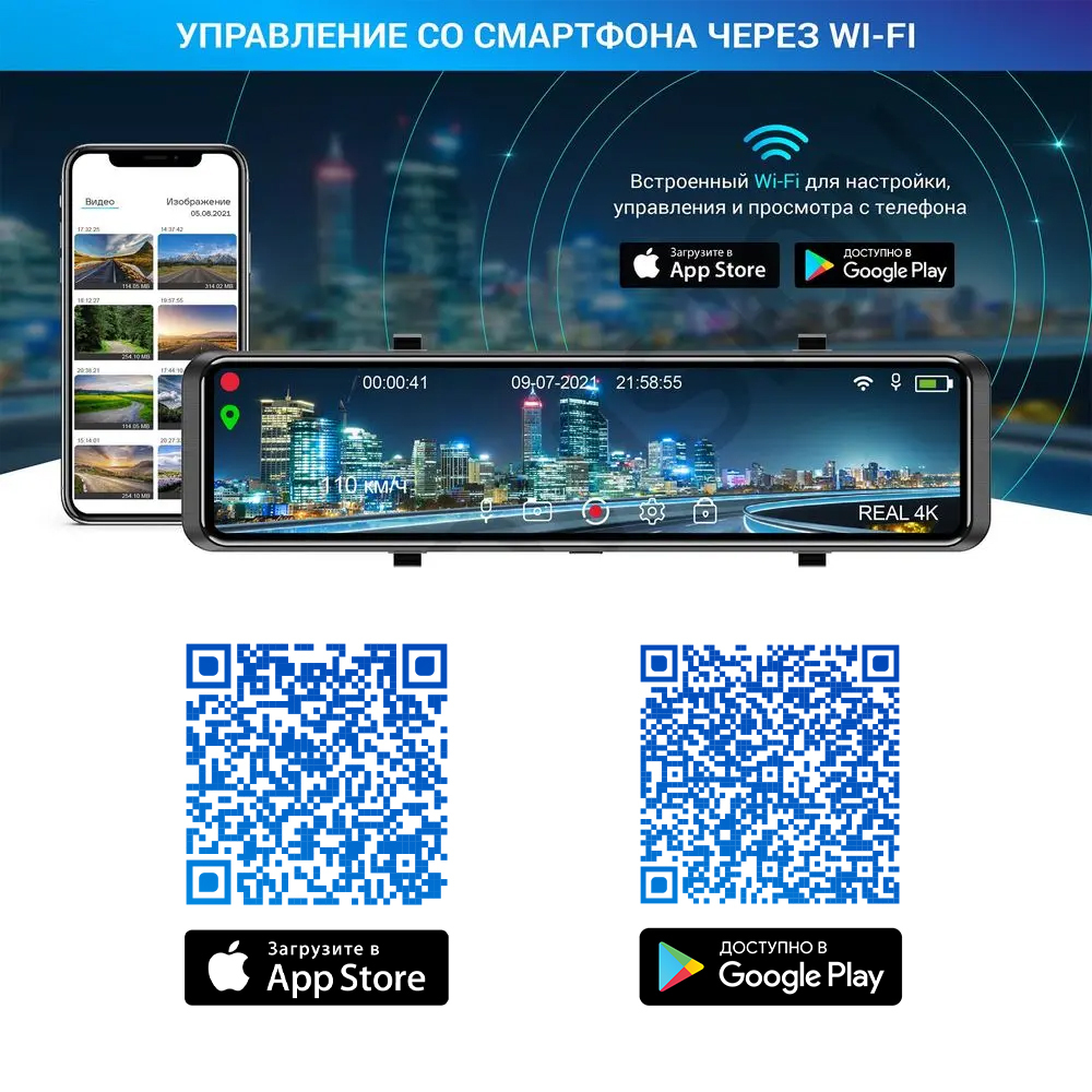Встроенный Wi-Fi модуль обеспечивает синхронизацию со смартфоном, благодаря специальному мобильному приложению. Управление основными настройками видеорегистратора, а также скачивание и просмотр записанных видео можно производить прямо на экране вашего мобильного устройства. (Подключение к приложению на смартфоне осуществимо только от оригинального зарядного устройства или зарядного устройства с параметрами заявленными в характеристиках).