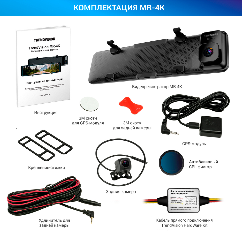 TrendVision MR-4K – Видеорегистратор-зеркало с реальным разрешением 4K Ultra HD (3840x2160px), новейшей матрицей Sony IMX 415, сенсорным 11" экраном, встроенным Wi-Fi, мощным процессором Hi3559V и умным видео-кодеком H.265. В комплекте задняя Full HD камера с парковочными линиями и GPS-информер (+SpeedCam)