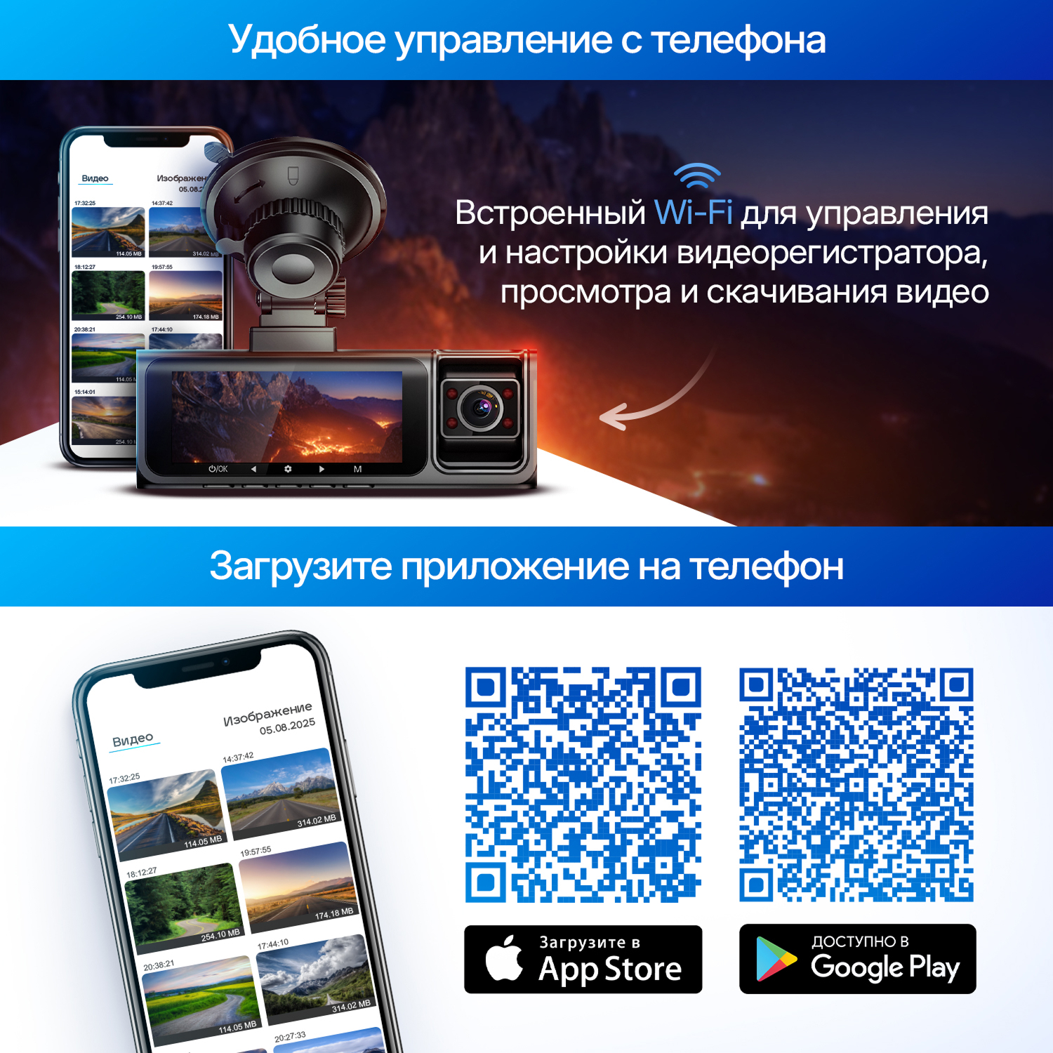 Угол обзора встроенных камер составляет 170° у фронтальной и 170° у салонной, благодаря чему регистратор охватывает широкий сектор перед автомобилем и полностью фиксирует происходящее внутри салона. Выносная задняя камера с углом 120° записывает ситуацию позади автомобиля, включая соседние полосы и пешеходные зоны. Такой широкий охват обеспечивает максимально полную картину событий вокруг машины в любых дорожных условиях.