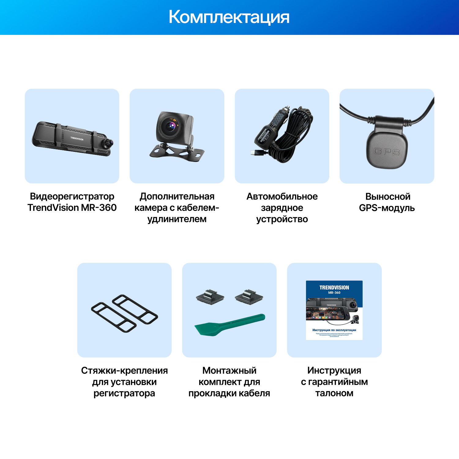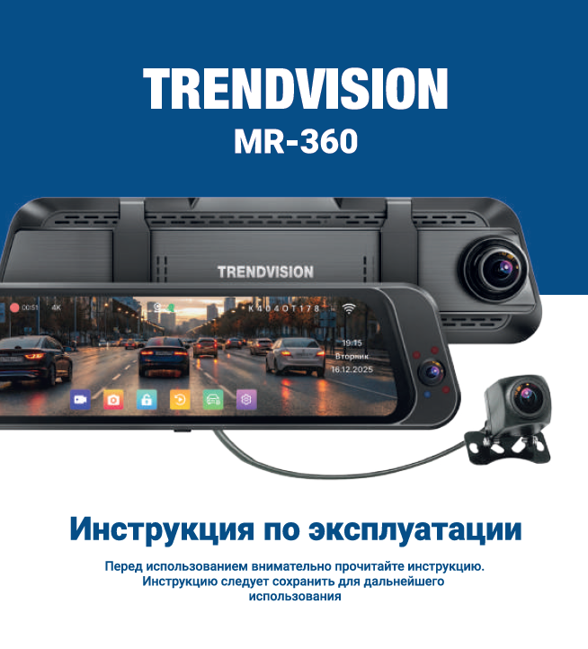 При включении TrendVision MR-360 автоматически начинает запись сразу с трёх камер: фронтальной, салонной и задней. Это позволяет одновременно фиксировать происходящее спереди, в салоне и позади автомобиля.
