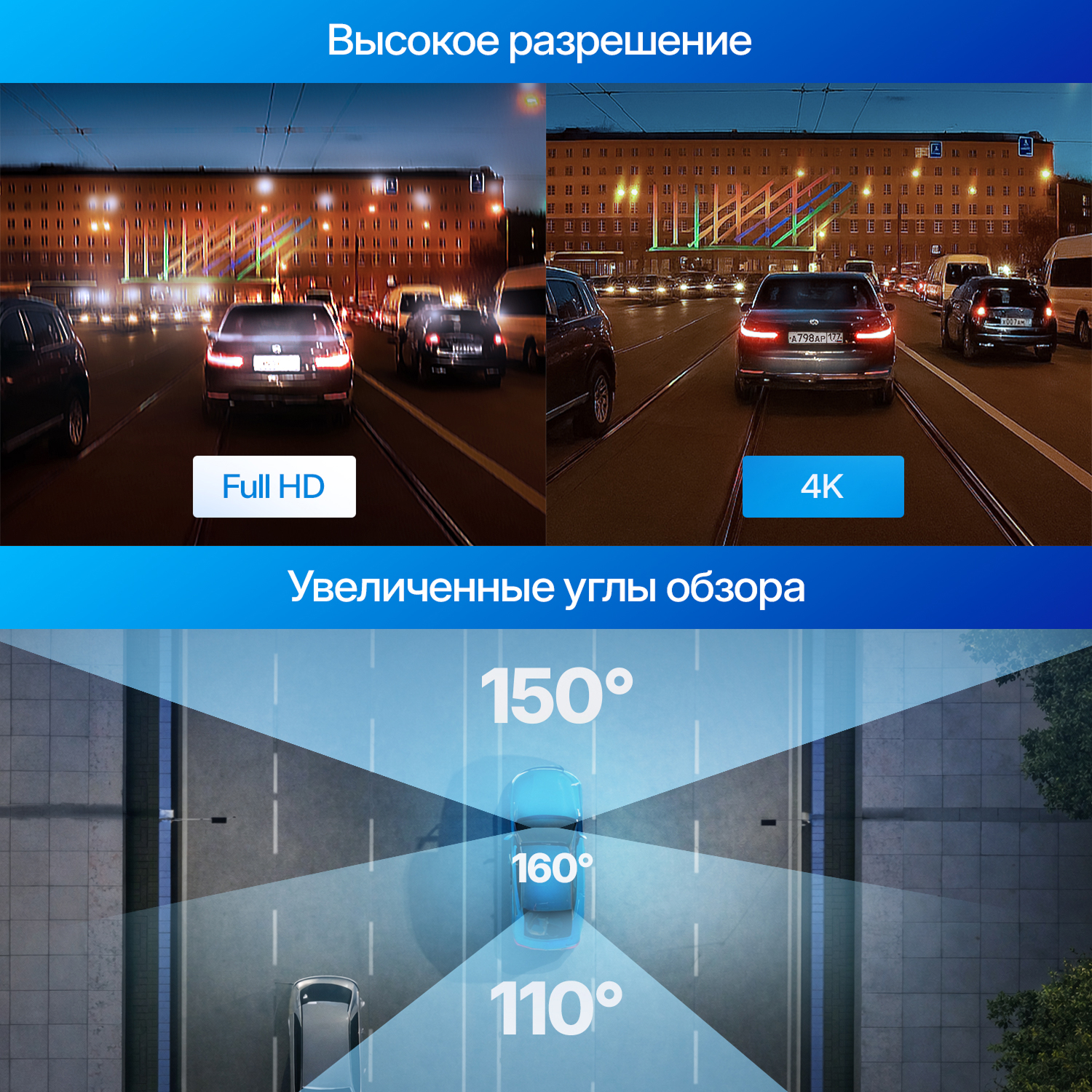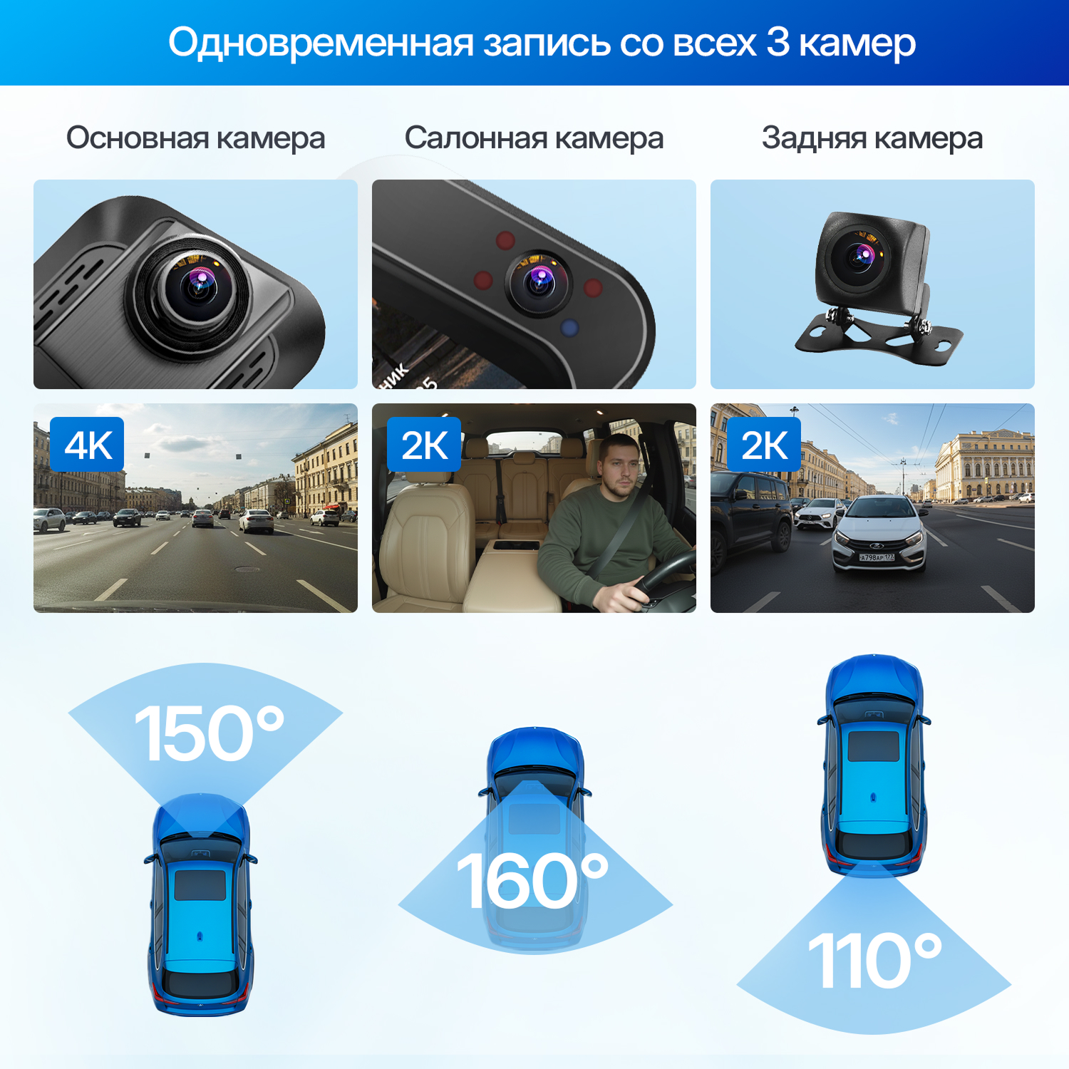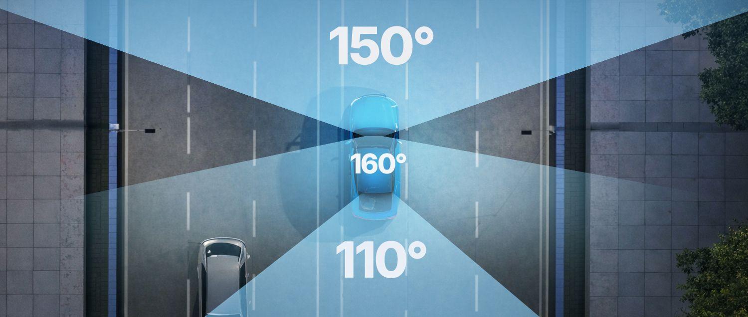 Широкие углы обзора камер составляют 150° / 160° / 110° (фронтальная / салонная / задняя камеры), что помогает охватывать больше пространства вокруг автомобиля.