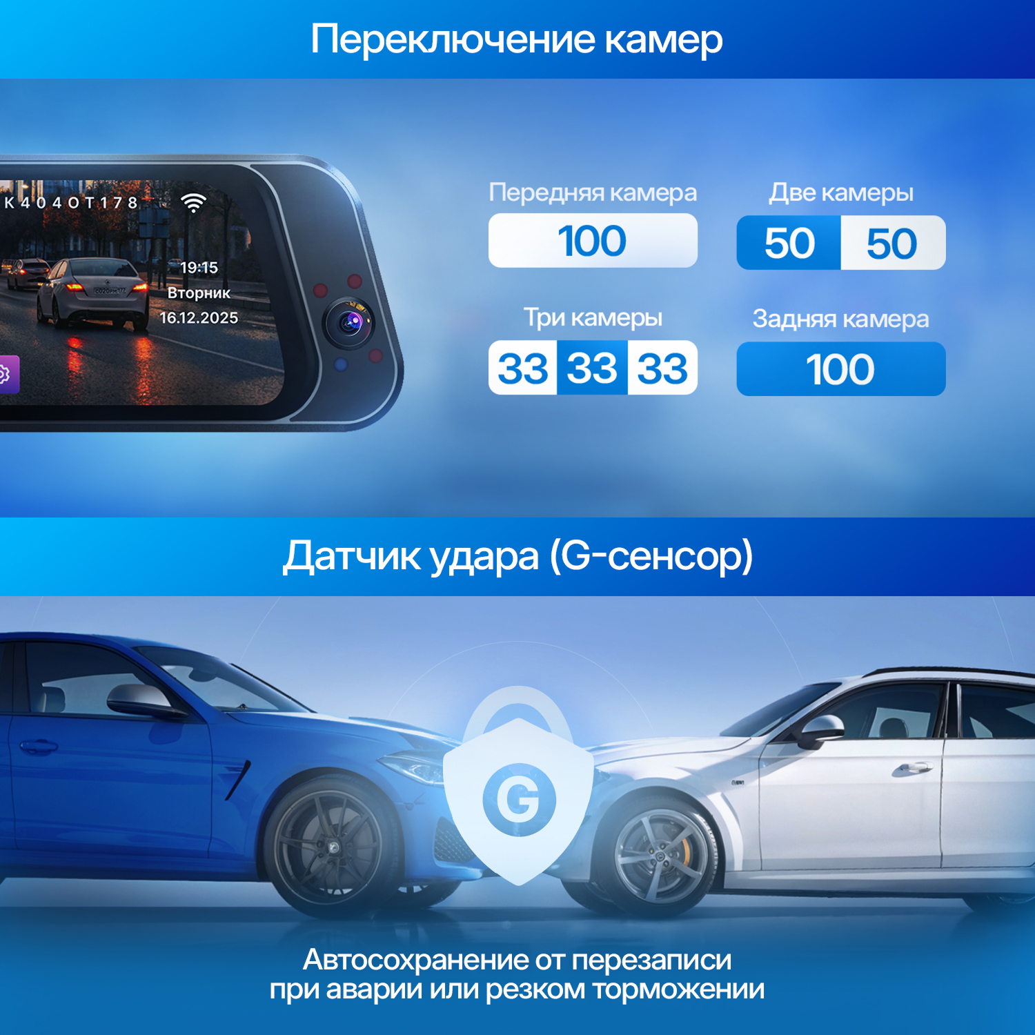 G-сенсор автоматически защищает файл от перезаписи при аварии или резком торможении.