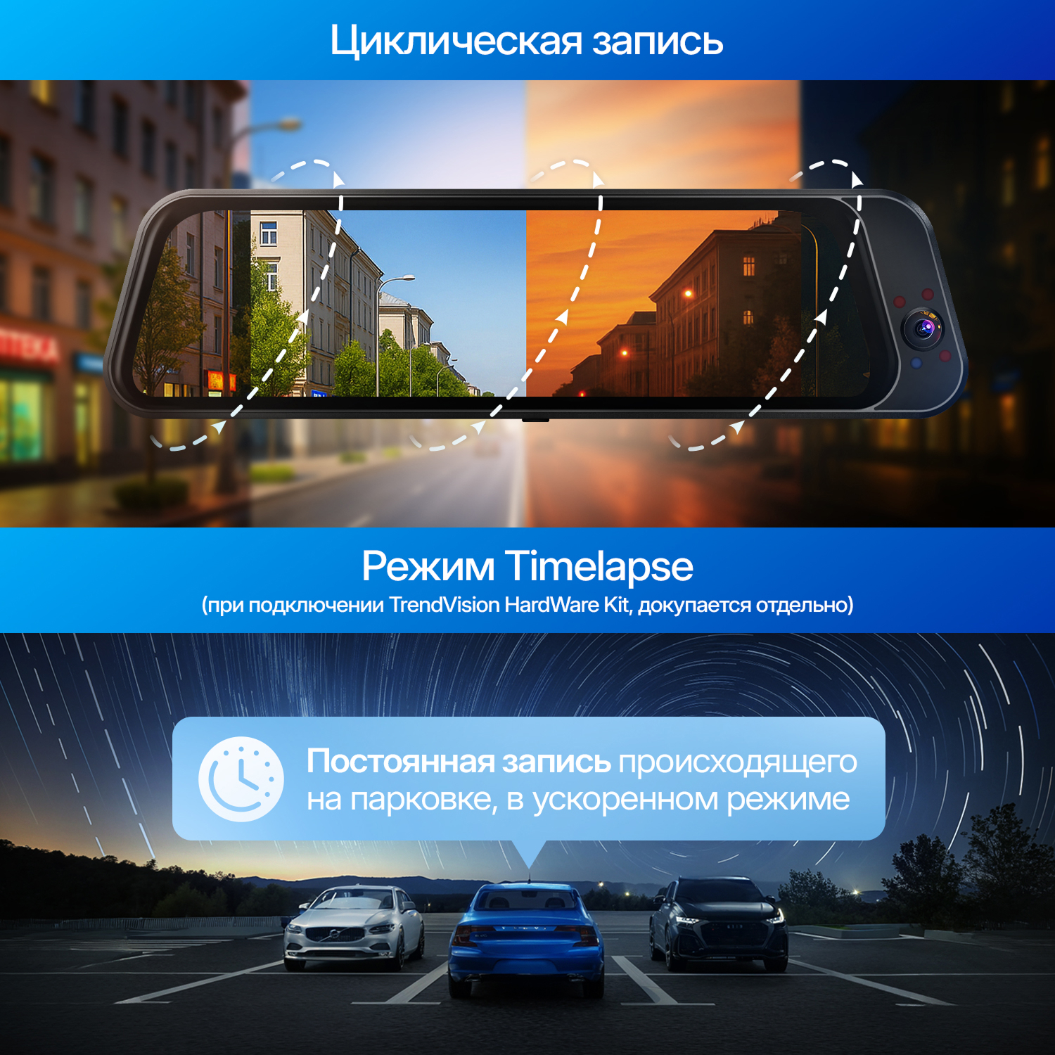 Режим Timelapse работает при подключении через TrendVision HardWare Kit (докупается отдельно) и позволяет вести ускоренную запись происходящего на парковке.