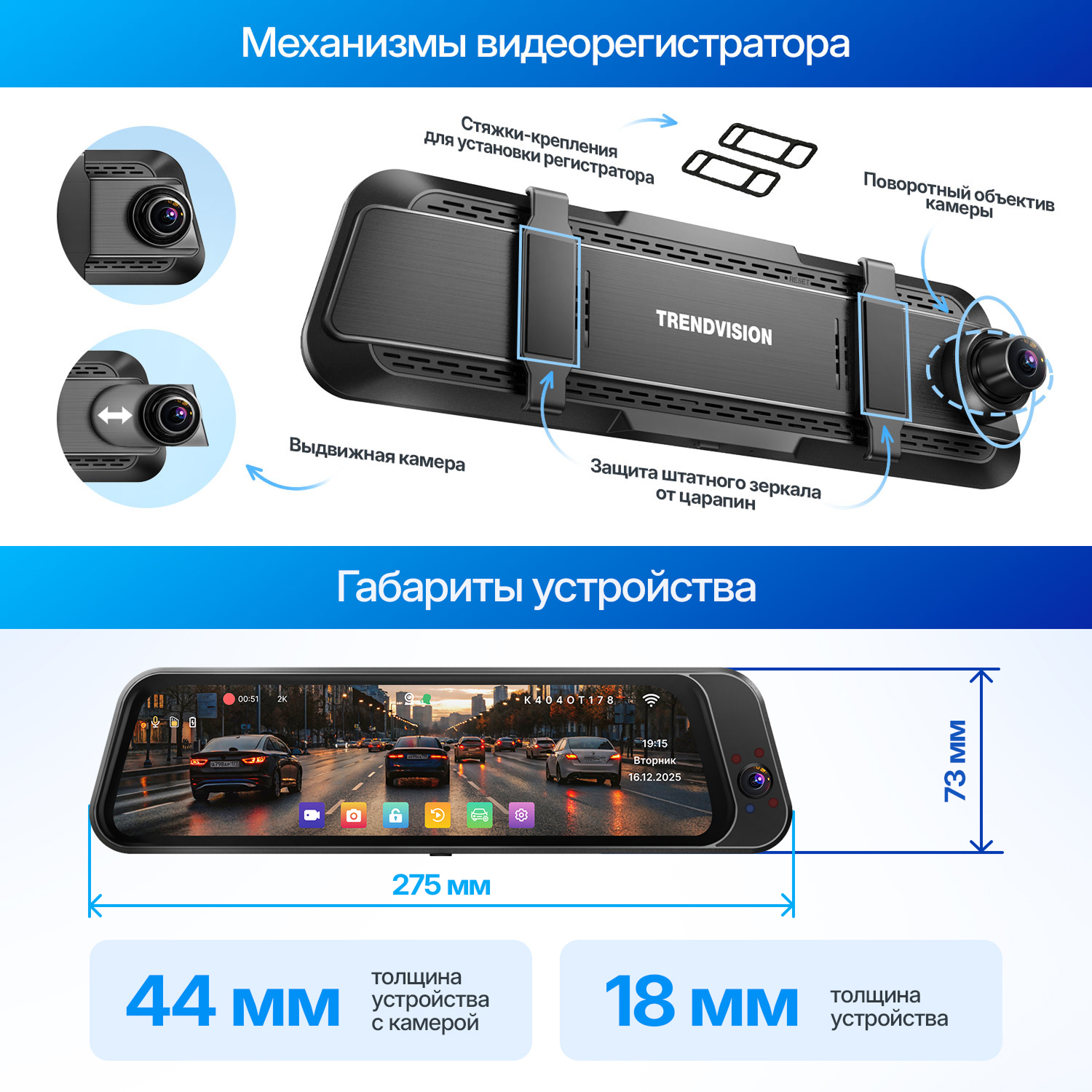 Конструкция предусматривает стяжки-крепления для установки на штатное зеркало, поворотный объектив камеры и защиту штатного зеркала от царапин.