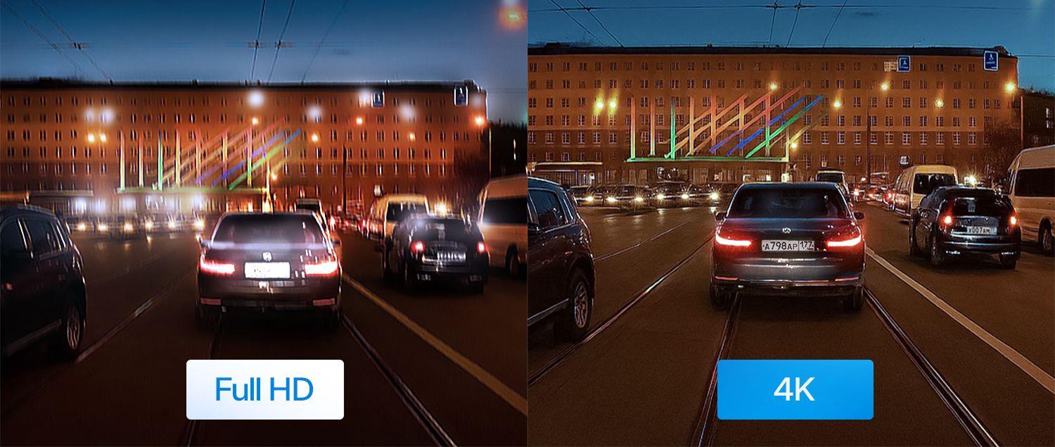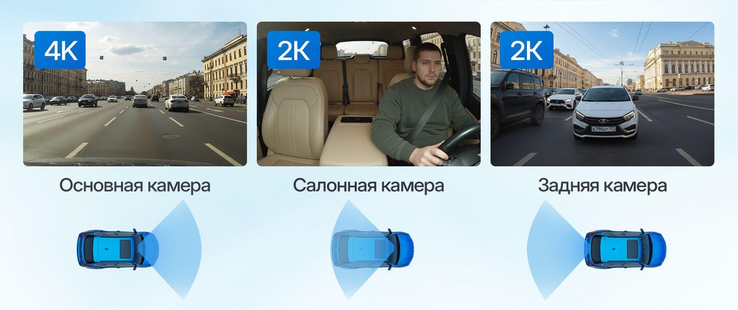 Передняя камера записывает в 4К (3840×2160p) 30 к/с, салонная — в 2К (2560×1440p) 30 к/с, задняя — в 2К (2560×1440p) 30 к/с. В меню также доступен режим записи 2К + 2К + 2К. Разрешение у всех трех камер интерполированное.