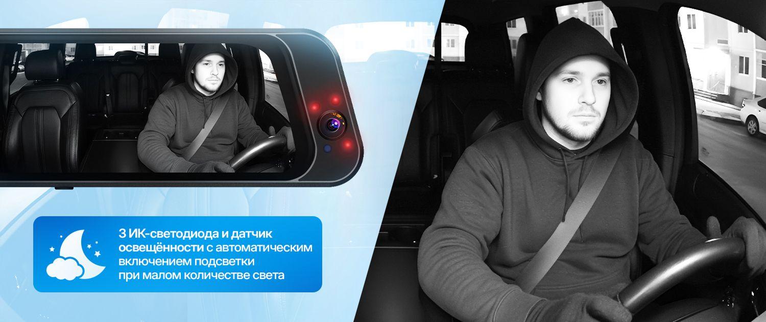 Салонная камера оснащена 3 ИК-светодиодами для видимости салона даже ночью. Датчик освещённости автоматически включает ИК-подсветку при низкой освещённости.