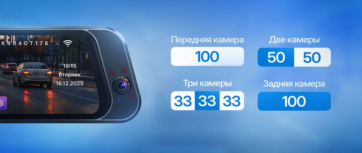 На дисплее доступны разные режимы отображения: передняя камера — 100%, две камеры — 50/50, три камеры — 33/33/33, задняя камера — 100%.