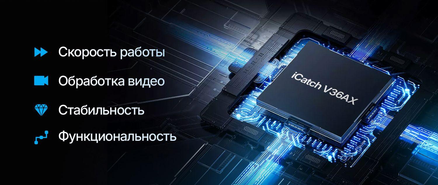 Видеорегистратор работает на процессоре iCatch V36AX, который обеспечивает стабильную запись и корректную работу функций устройства.